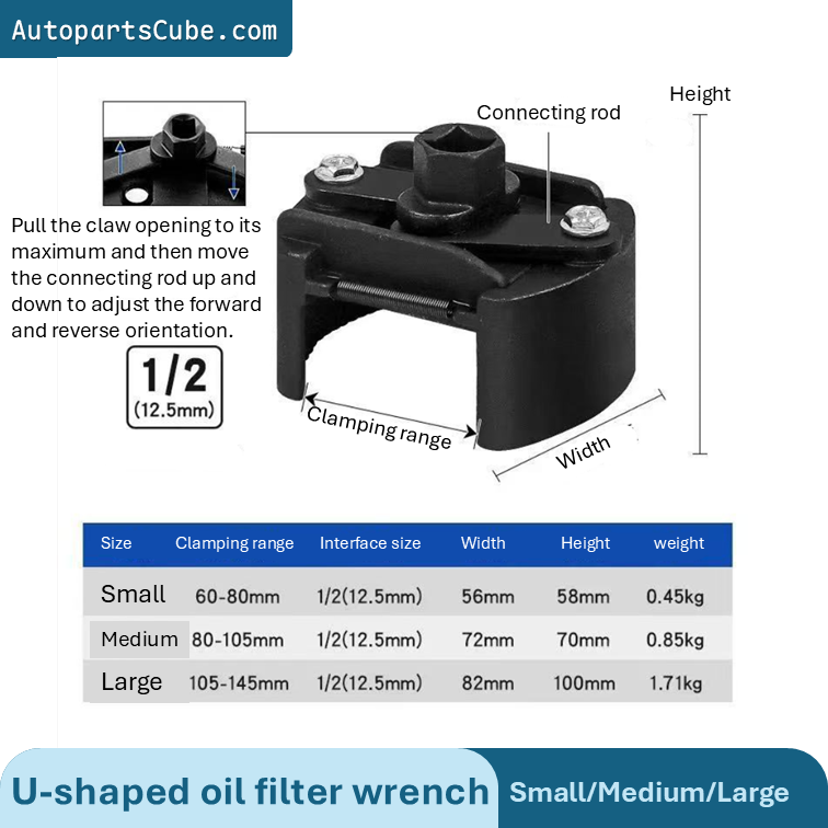 The German-style dual-jaw structure with an adjustable U-type body easily fits most oil filters ranging from 60mm to 145mm in diameter. It provides even force distribution to prevent slipping, eliminating the common issues of weak grip, slippage, and damaged filters caused by ordinary wrenches.